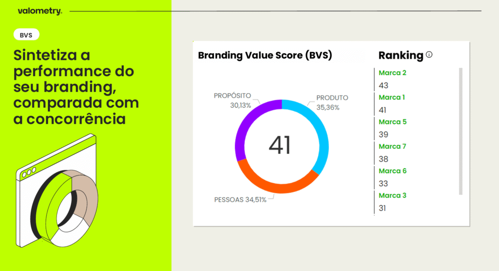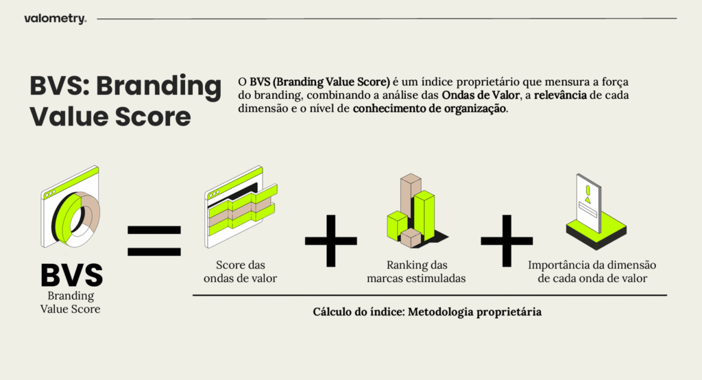 - Valometry: Integra dados qualitativos e quantitativos para medir o impacto da marca em tempo real, com indicadores acionáveis como Branding Value Score (BVS). O BVS é calculado com base em três componentes principais: score das Ondas de Valor, ranking das marcas estimuladas e importância da dimensão de cada onda de valor.